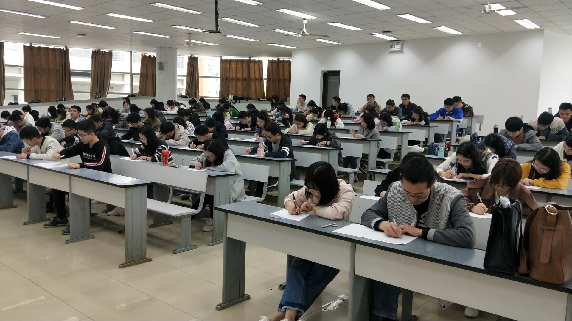 为避免与其他考试时间发生冲突,本次考试的时间从12:30-14:00。12:20左右所有同学已经来到了教室,监考老师安排好考试座位,告知了大家注意事项,五分钟过后,所有同学自觉将资料、手机放在讲台上,老师发放了考试试卷。12:30,考试正式开始,整场考试,同学们全神贯注,非常的认真。