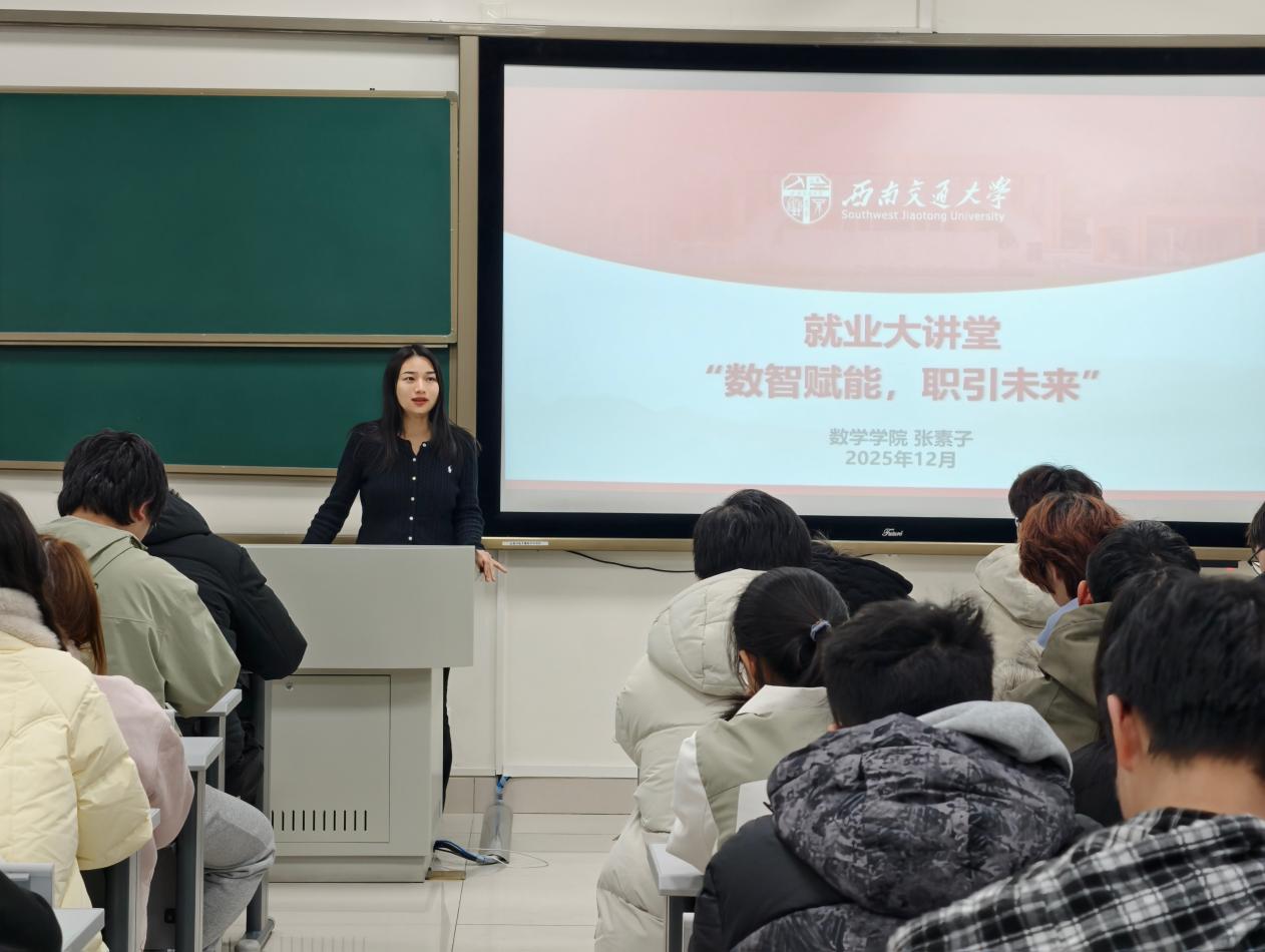 为帮助数学、大数据、统计专业本科生把握数智时代就业机遇、明晰职业方向,12月1日晚,437bwin必赢国际“数智赋能,职引未来”就业大讲堂在X30610顺利举办。437bwin必赢国际团委书记张素子主讲,为百余名数学学子带来专业实用的就业指导。