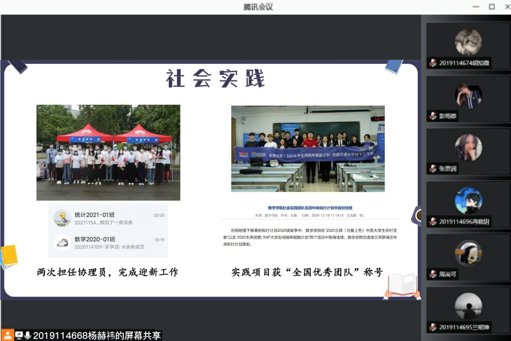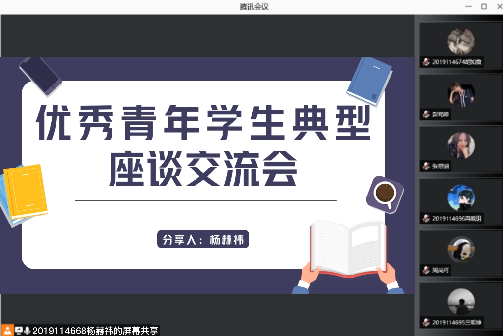12月5日下午15:00,统计学2019级1班团支部“优秀青年员工典型座谈交流会”于腾讯会议线上召开。本次经验交流分享由2020——2021年度“竢实扬华奖章”获得者,统计2019-01班的杨赫祎同学主持。他向同学们分享了他在两年多的大学学习生活中的经验体会。