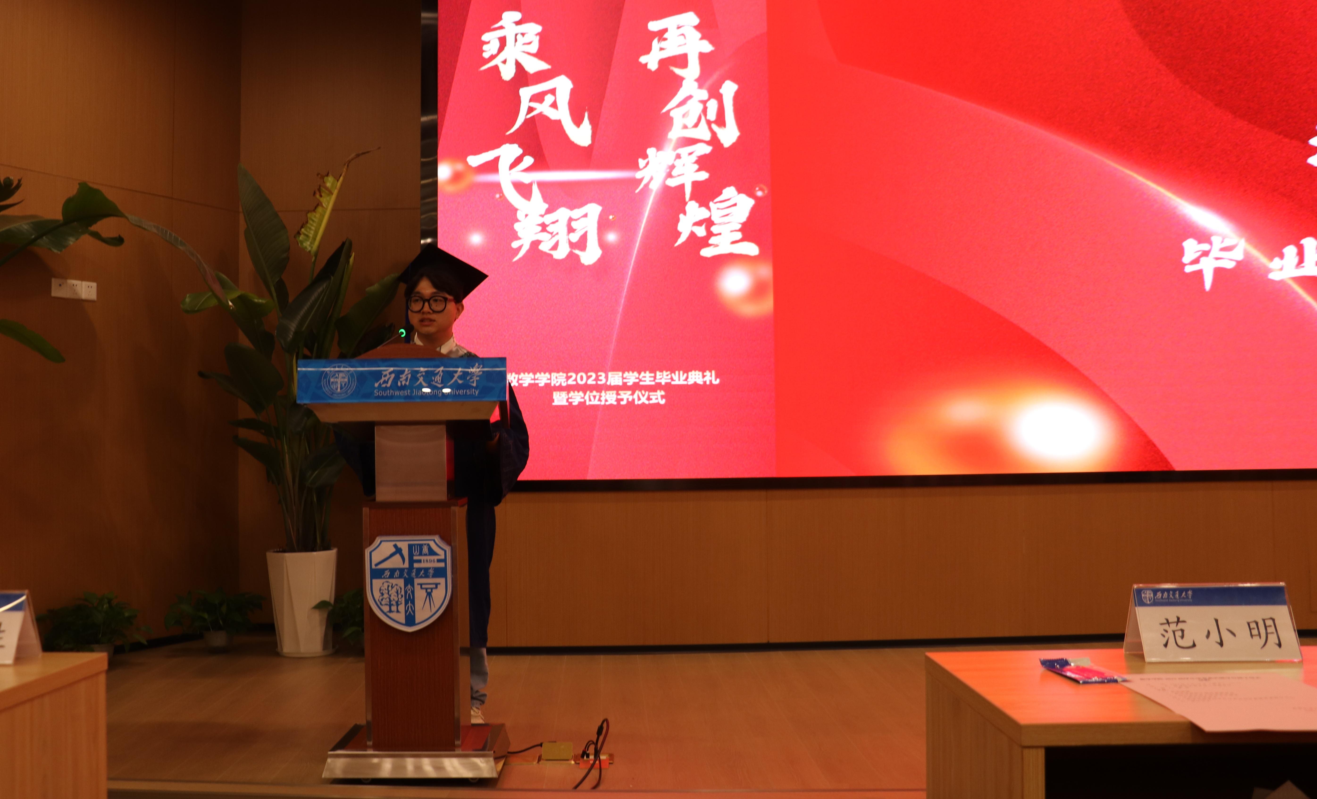离别之际,杨晗经理祝愿同学们在新的赛道上跑出加速度,书写出更加绚烂多彩的篇章。同时,杨晗经理还叮嘱了同学们三点:一为“立青矜之志,履践致远”,要心系“国家事”、肩扛“国家责”,要以国家富强、人民幸福为己任,胸怀理想,志存高远;二为“行远自迩,踔厉奋发”,应秉持“竢实扬华,自强不息”的交大精神,在实践中增长知识、锤炼品格,以真才实学服务人民,以创新创造贡献国家;三为“奋楫笃行,臻于至善”,要学会感恩伟大的祖国、感恩伟大的时代,感恩陪伴多年的母校,感恩辛勤付出的老师,把青春奋斗融入到党和人民事业中,为国家发展聚能、为民族复兴蓄力。他提到,新时代青年将接过先辈手中的接力棒,坚定理想信念,从“国之大者”中寻找方向,扛起这份报效祖国的责任。杨晗经理表示,交大永远是同学们最温暖的港湾,交大数院也期盼与各位同学共同走向辉煌!最后,杨晗经理再次向2023届毕业生们致以诚挚的祝贺。