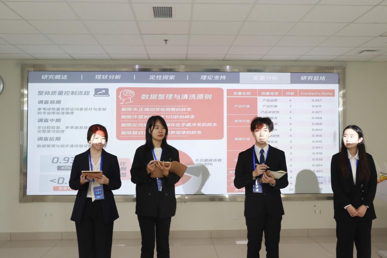 各参赛队伍围绕老年群体“候鸟式”度假旅游消费行为、生鲜电商平台营销策略、古镇旅游、教育帮扶、国货浪潮、客家文化、老员工“特种兵式旅游”、年画文创、共享茶室等热点问题开展调查研究,通过PPT、视频、情景剧、曲艺、绘画等形式,借助多媒体或实体道具等工具,多维度展示了他们的研究过程以及研究成果。在答辩过程中,评委老师们的提问切中要害,为同学指出优势与缺点,真正做到了以赛促学。同时,评委老师从研究选题、文献研究、分析方法、方案设计、实地调查等多个方面对参赛作品提出建设性的建议,为参赛团队后期对于报告的进一步完善指明方向。
