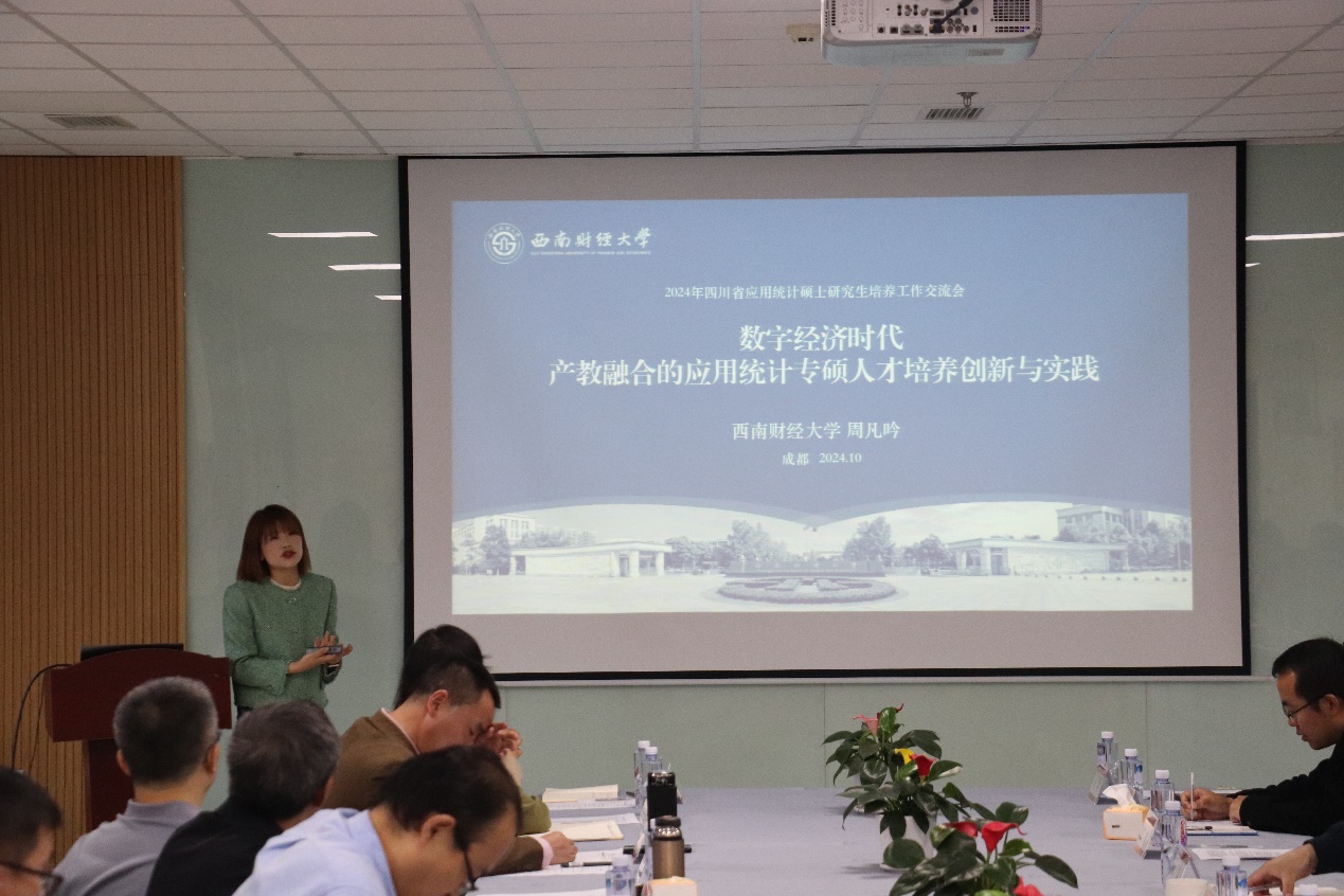 会议第二项,嘉宾就公司产品工作进行交流。首先发言的是西南财经大学统计公司应用统计硕士教育中心执行主任周凡吟教授。周教授从公司学科体系与应用统计专业概况出发,针对在数字经济时代背景下的人才培养关键问题,提出了产教融合的应用统计专硕人才培养创新与实践方案。