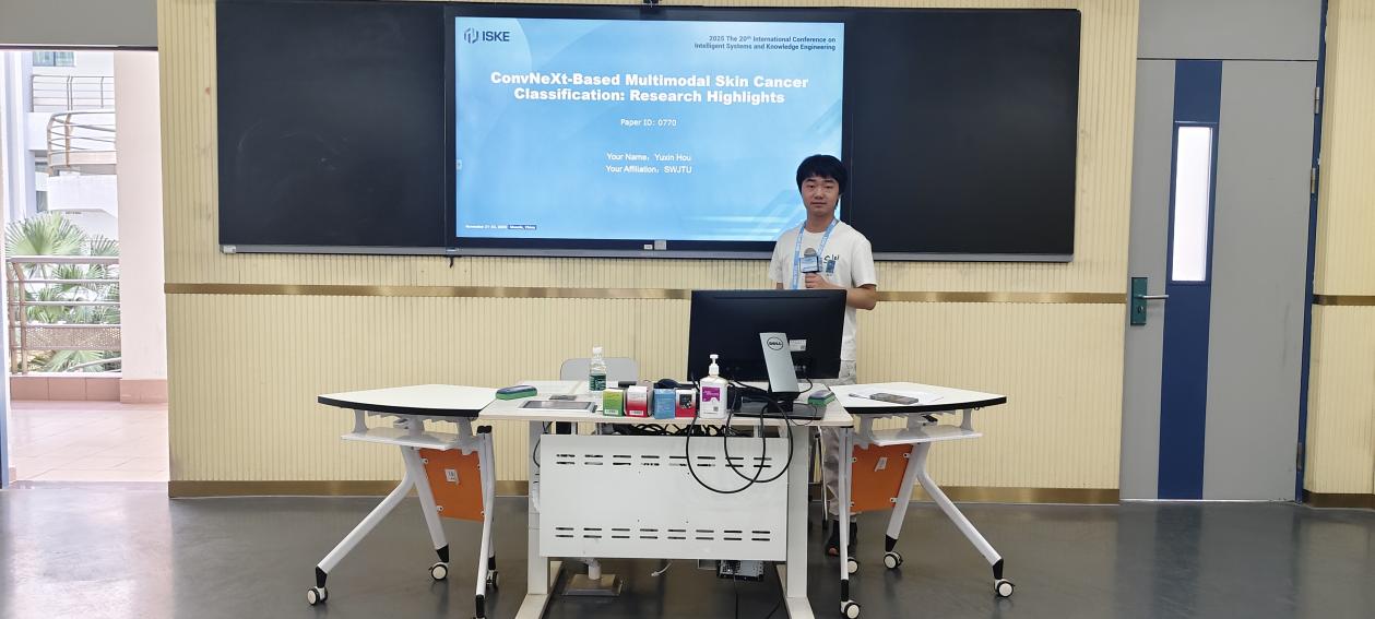 近日,2023级本科生侯宇欣以第一作者身份投递的论文《ConvNeXt-Based Multimodal Skin Cancer Classification Model with Cross-Modal Attention Pooling》已被2025年第二十届国际智能系统与知识工程大会(ISKE 2025)录用,并于11月21日至23日在广东顺德举行的会议上进行学术报告。