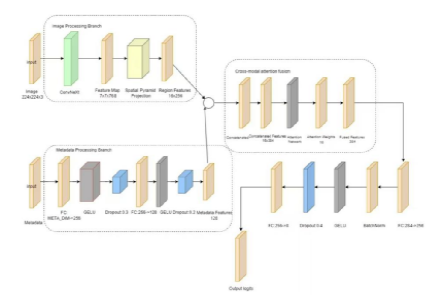 皮肤癌智能分类是保障皮肤病诊疗效率与患者健康管理的关键任务。传统方法依赖人工阅片,存在诊断延迟、漏诊误诊风险;现有深度学习模型多基于单模态皮肤镜图像,难以充分利用临床元数据,且在模态融合时易忽略特征相关性,导致对恶性黑色素瘤等复杂病变的分类精度不足。为解决上述问题,论文提出了一种基于ConvNeXt与跨模态注意力池化(CMAP)的多模态皮肤癌分类模型,融合皮肤镜图像的视觉特征与年龄、性别、病变部位等临床元数据特征。实验在ISIC2019公开数据集上验证了方法的有效性,对罕见病变类别(如光化性角化病)的召回率显著提升。