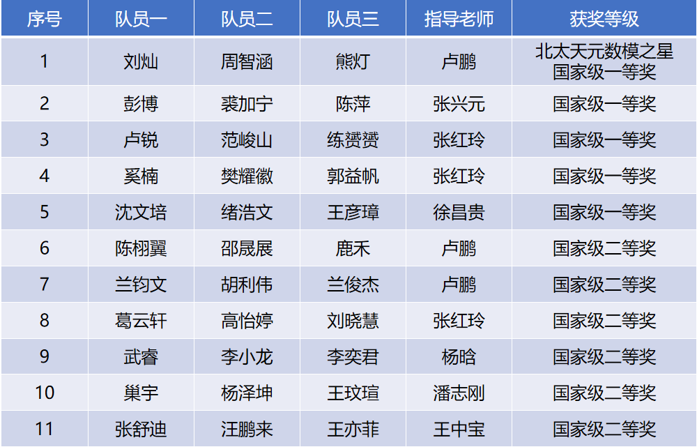437bwin必赢国际师生团队共获得国家级一等奖5项、国家级二等奖6项,获奖质量、数量总成绩继续保持全国前列。其中,由计算机与人工智能公司刘灿、交通运输与物流公司周智涵、计算机与人工智能公司熊灯同学组成的跨专业团队,在437bwin必赢国际卢鹏老师的指导下,从全国68311支参赛队伍中脱颖而出,成功斩获本科组最高奖“北太天元数模之星”殊荣,这也是公司继2021年斩获全国老员工数学建模竞赛“高教社杯”后,在数学建模竞赛领域的又一重大突破。