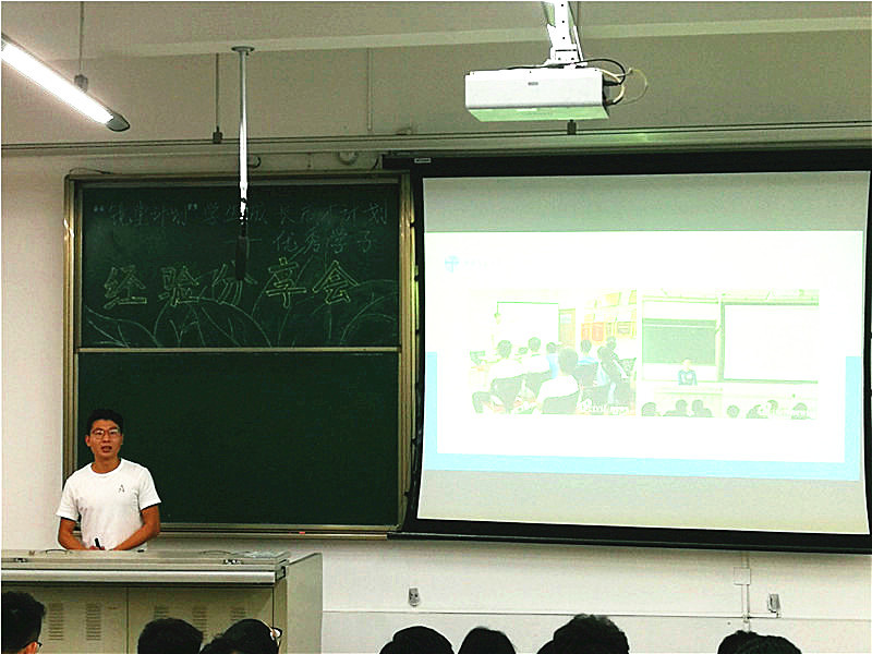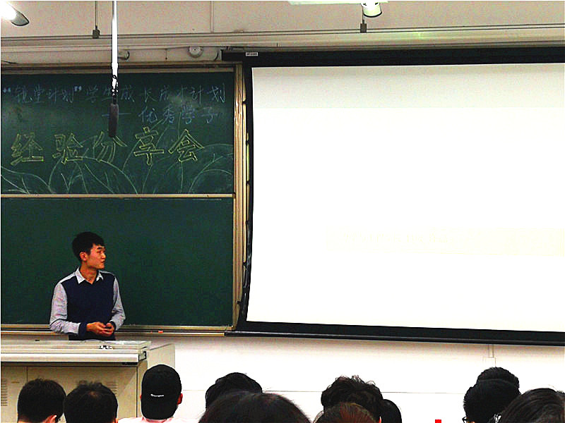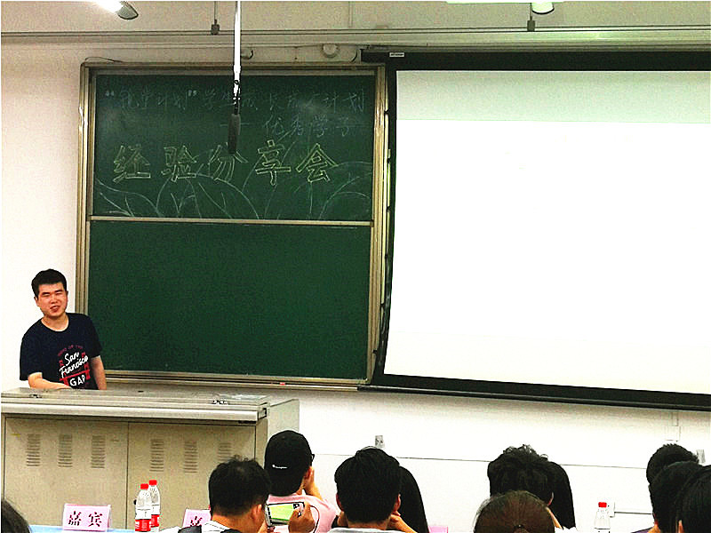 最后分享自身经验的便是2014级力学与工程公司的优秀学子许磊,他斩获清华、北大、浙大、中科大等高校offer。其开场便是他本人的大学成绩发展情况,直观地表现出了努力勤奋的重要性。他鼓励大家相信自己,不能妄自菲薄。又以自身的发展为例,讲述了参赛的作用和保研的侧重点,充分地表现出了他对自我目标清晰的认知。