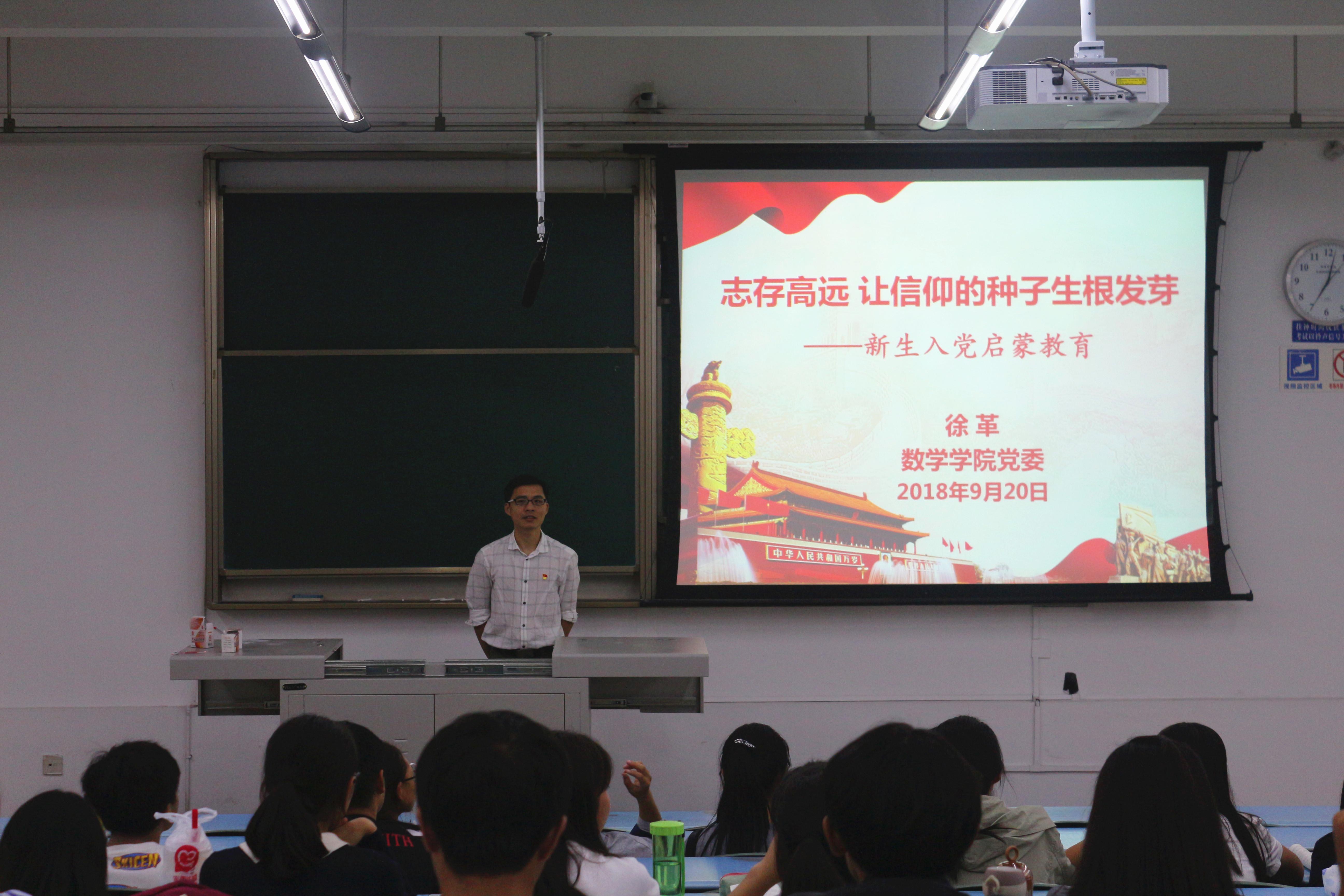 9月20日晚上七点,数学公司党委书记徐革为2018级全体本科生开展了以“志存高远,让信仰的种子生根发芽”为主题的入党启蒙专题讲座,公司党委副书记杨育鸿和18级辅导员钟义婷也到场聆听了本次讲座。