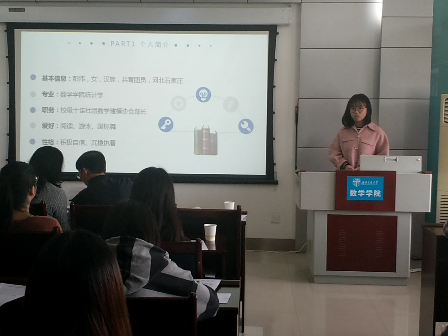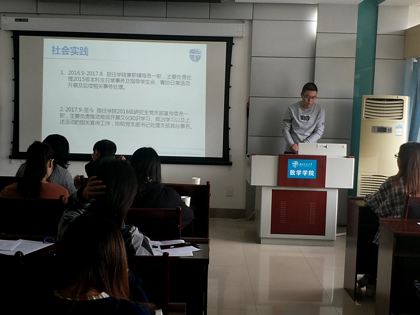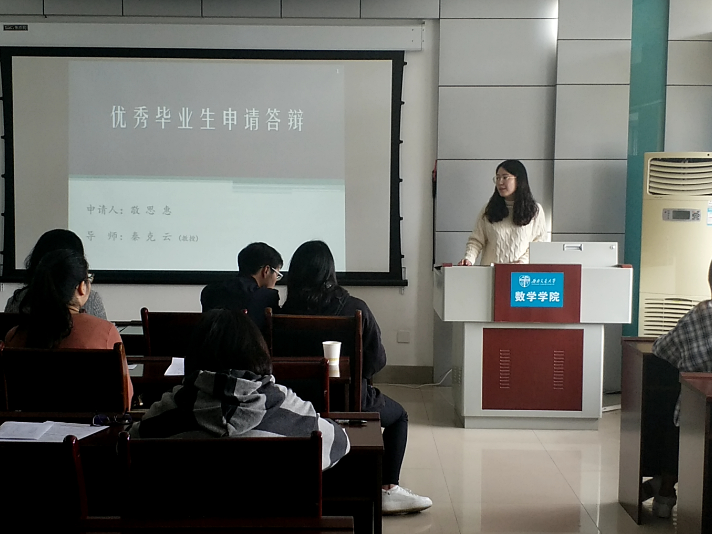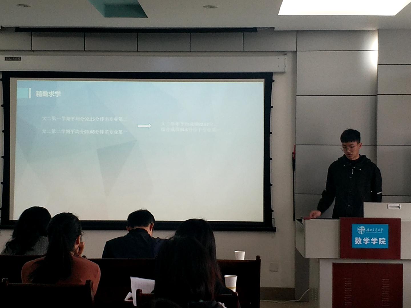 首先进行的答辩是竢实扬华奖章答辩,答辩人刘冰列举了近年来所收获的荣誉,把他的成就归功成其老员工涯中的所遇所为,展示出了“不凡的经历塑造不凡的人”,突出了自身的强劲实力和对科学的不懈追求。紧接着是省级优秀毕业生的评选答辩,答辩人张雁灵从学习成绩、员工工作、科研竞赛以及社会实践四部分划分了她的老员工活,展示出了全面发展的生活态度以及优秀的综合实力。继而是三好标兵的评选答辩,由郭奥洋、杨思哲、郑伟杰、蔡逸、伍舒妮、孙济任、彭炜、张璇八位答辩人向大家展示自身的能力,从学习情况、科研竞赛、员工工作以及社会工作等方面更详尽地突出他们自身的能力,使得每一位同学自身具有的优秀特质都得以展现。