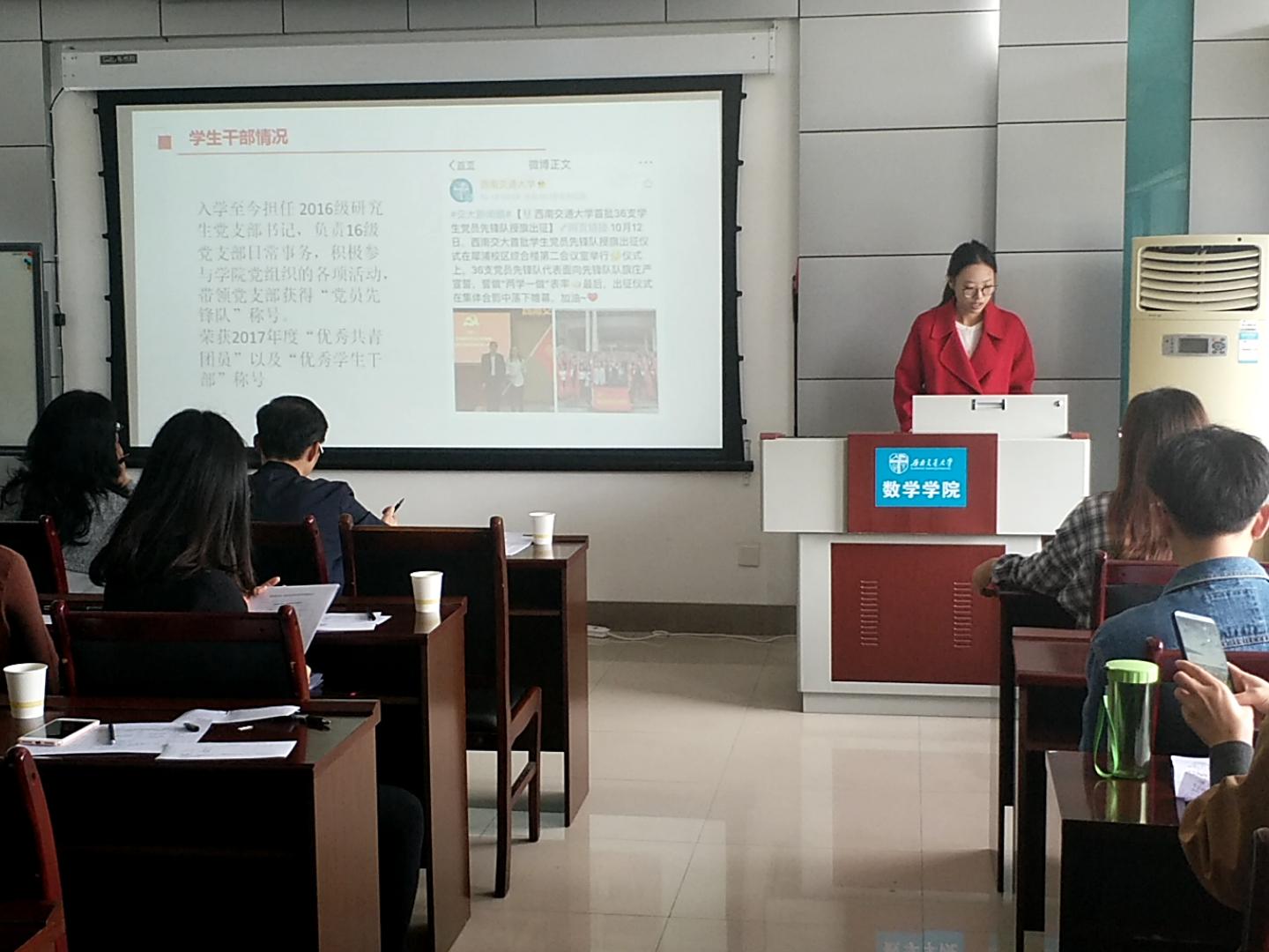 10月9号上午九点半,437bwin必赢国际评奖评优答辩评选在X2511召开。担任答辩会的评委有数学公司党委书记徐革教授、党委副书记杨育鸿老师,公司团委书记邓思然老师,班导师代表程世娟、王中宝老师,辅导员代表钟义婷、谢童心老师以及本科生代表员工会主席祁元和研究生代表研会主席杨涵。