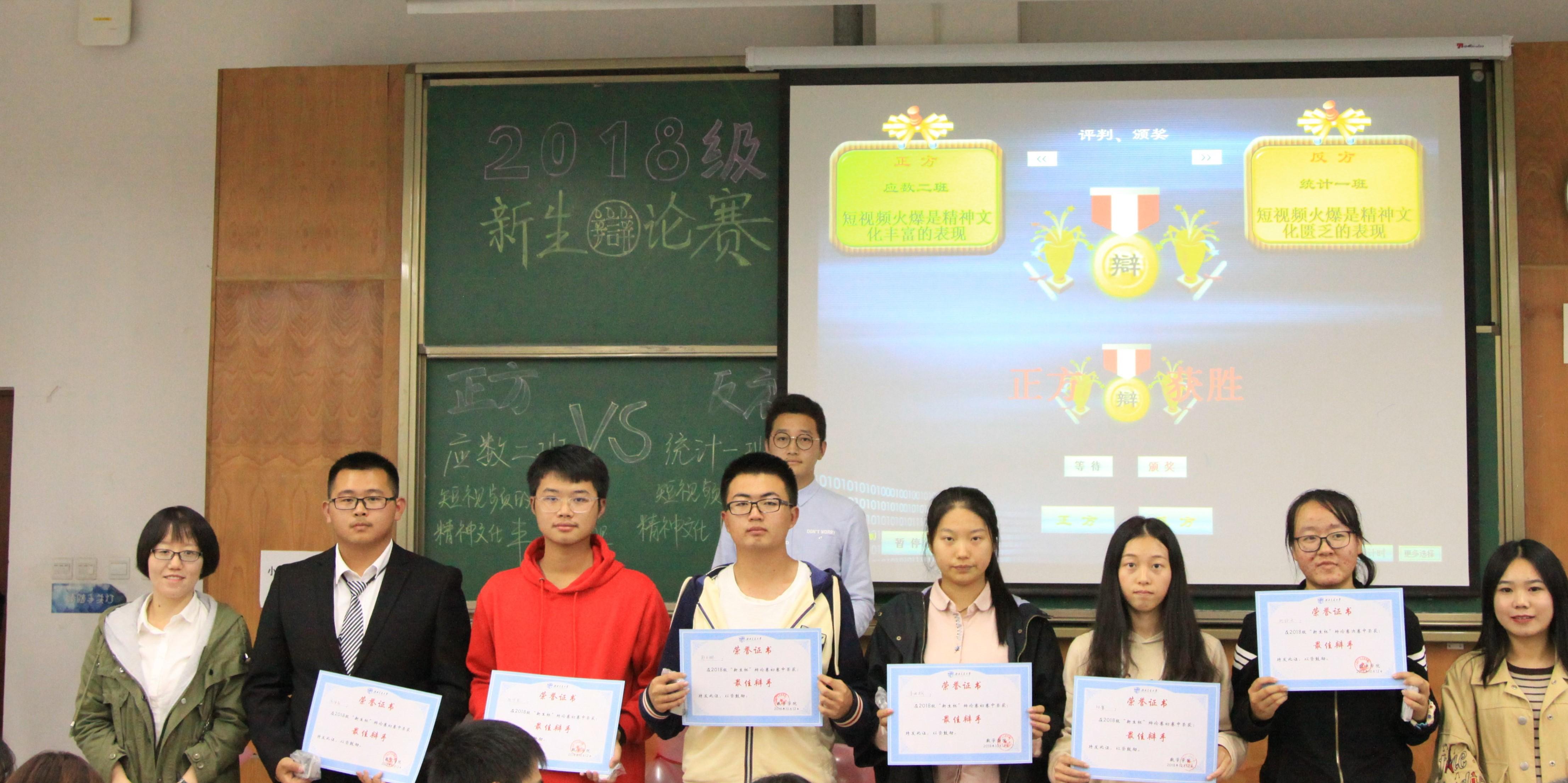 最终主持人揭晓本场比赛的结果,数学二班获得了最终胜利,数学二班二辩获得了最佳辩手的荣誉称号。颁奖仪式结束后,2018级新生辩论赛决赛正式拉下完美帷幕。