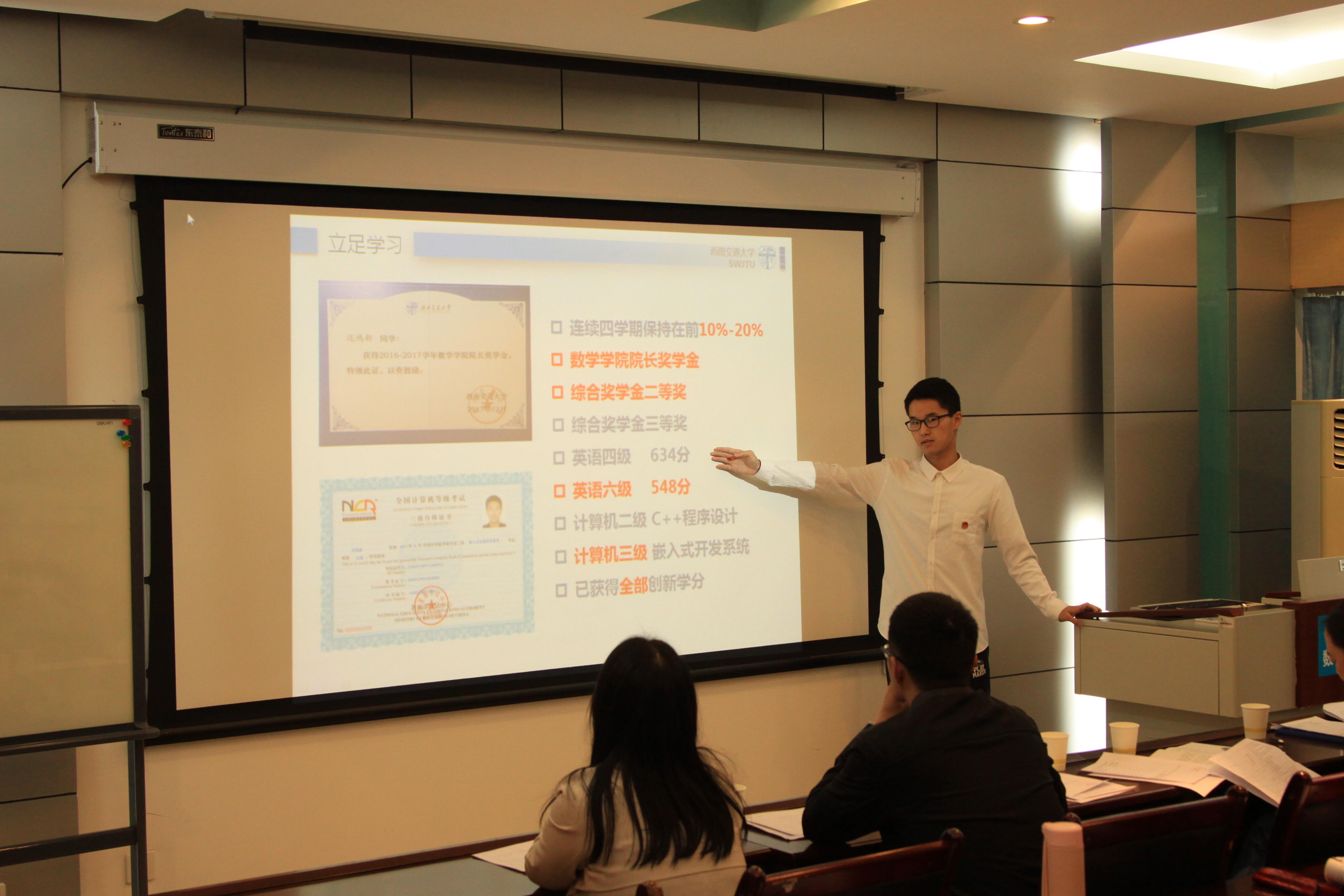 首先进行的是极客数学帮奖学金答辩,答辩者从学习情况,科研竞赛,员工工作,社会实践等方面进行了自我的展示,彰显了交大学子优秀的综合实力。