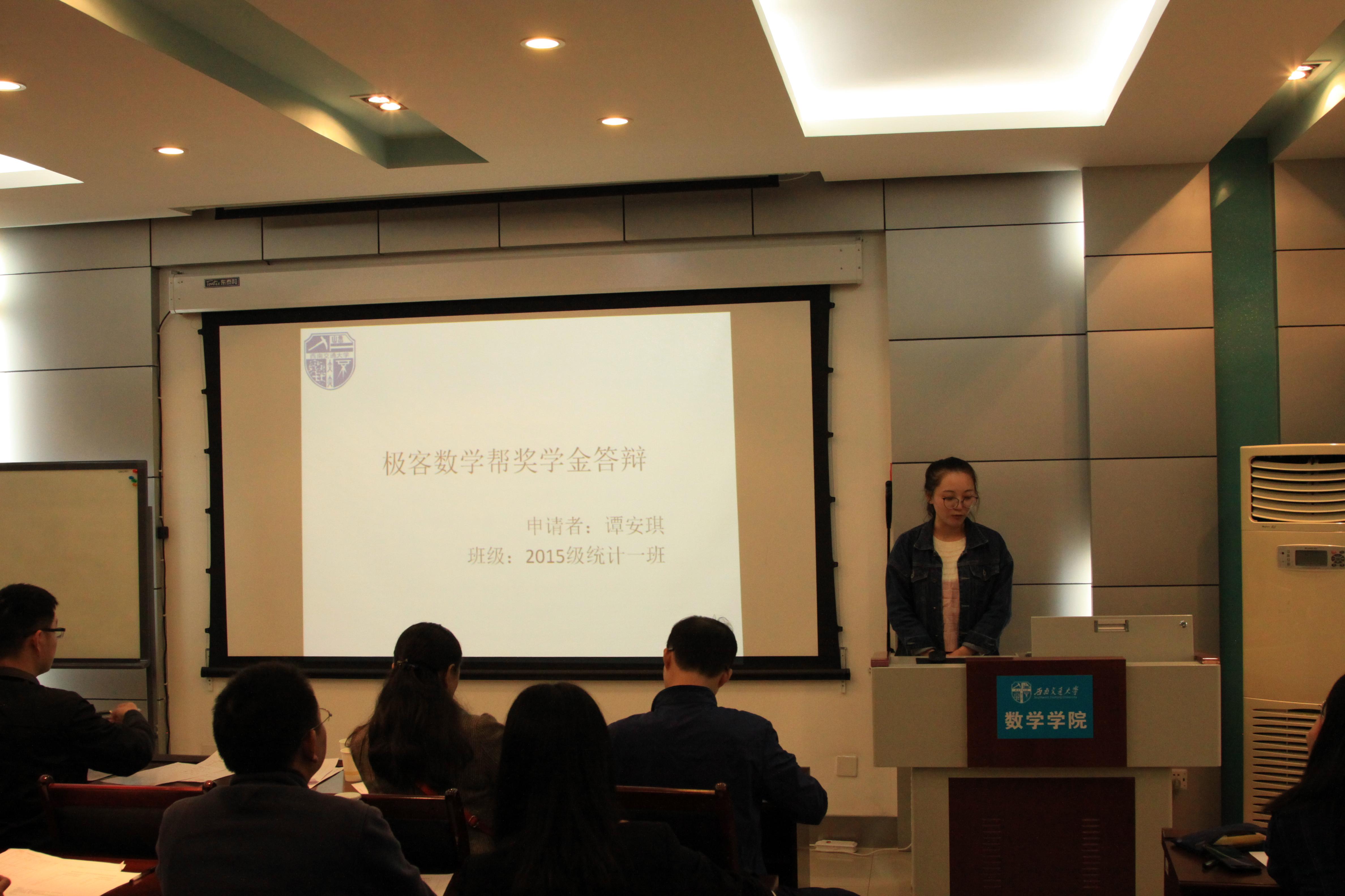 然后进行的是极客数学帮助学金答辩,答辩者介绍了自己的家庭经济情况,也展示了自己在公司取得的一些优异成绩,同时表达了自己在日后继续奋发向上的决心。