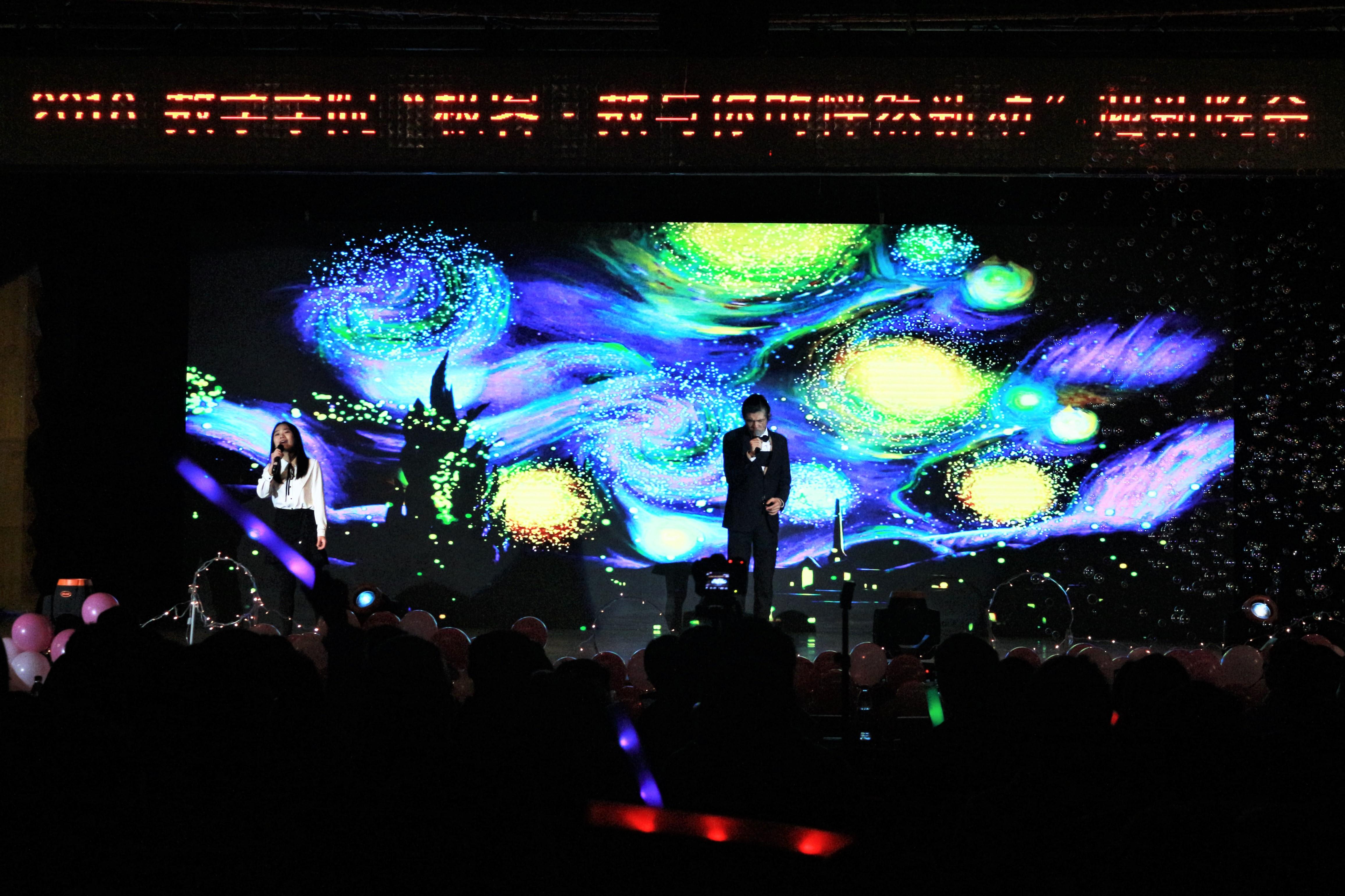 随后迎新晚会节目表演正式开始。第一个节目是应数二班的舞蹈表演《倾杯》,伴随着欢快美妙的音乐,应数二班的同学在舞台上利用水袖婀娜起舞。第二个节目是由17级辅导员谢童心老师与17级统计二班胡皓量同学带来的粤语合唱《可惜我是水瓶座》,观众沉浸在优美的歌声中,尽情享受这天籁之声。